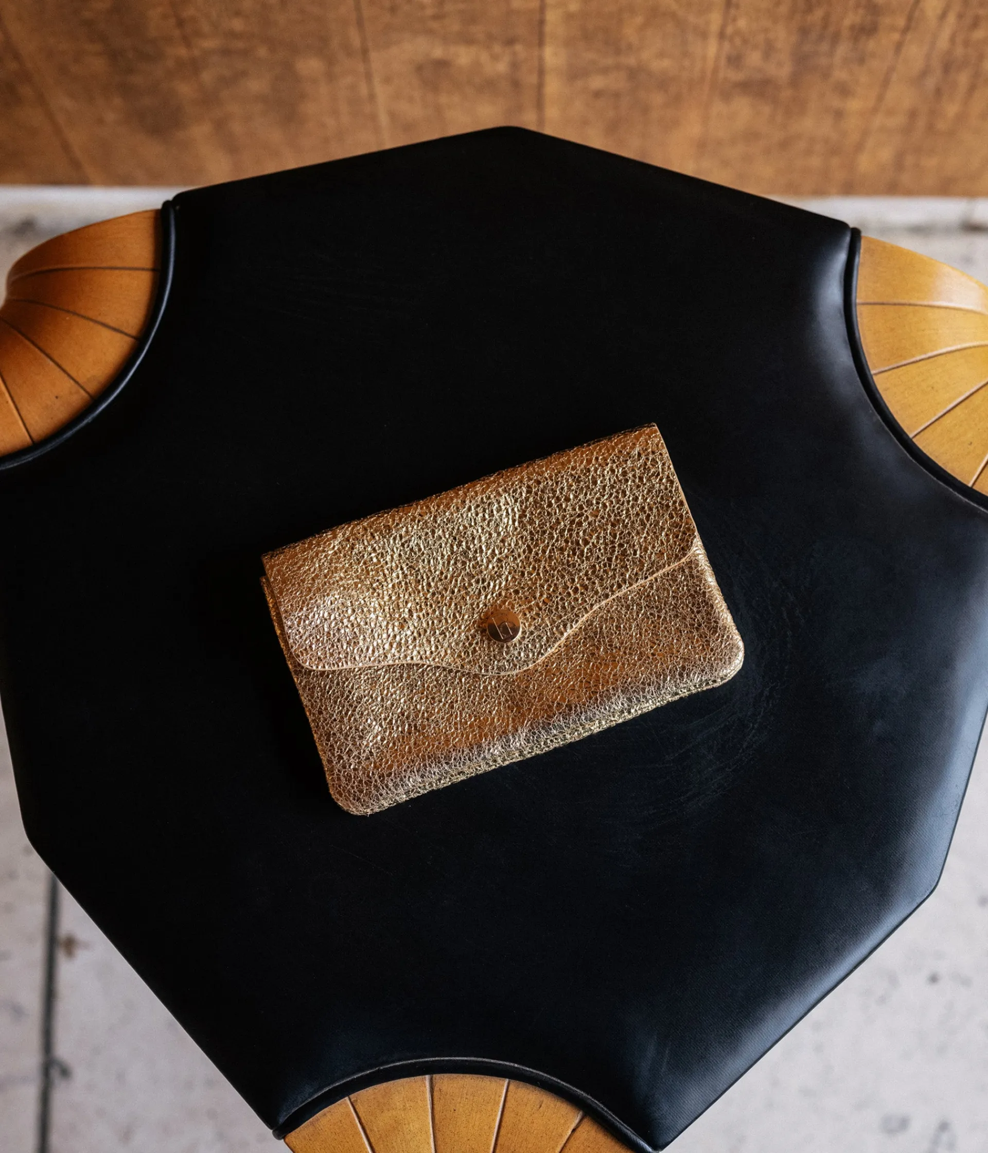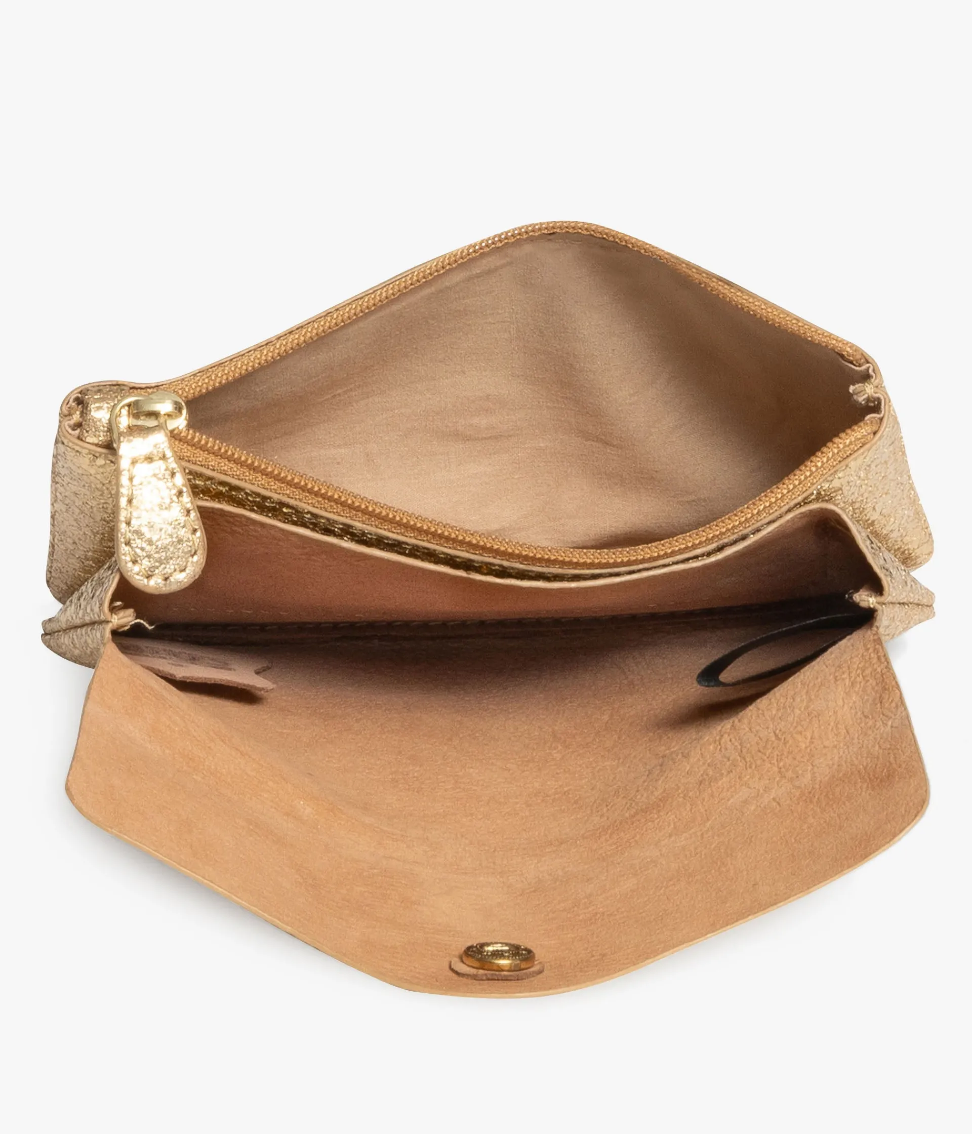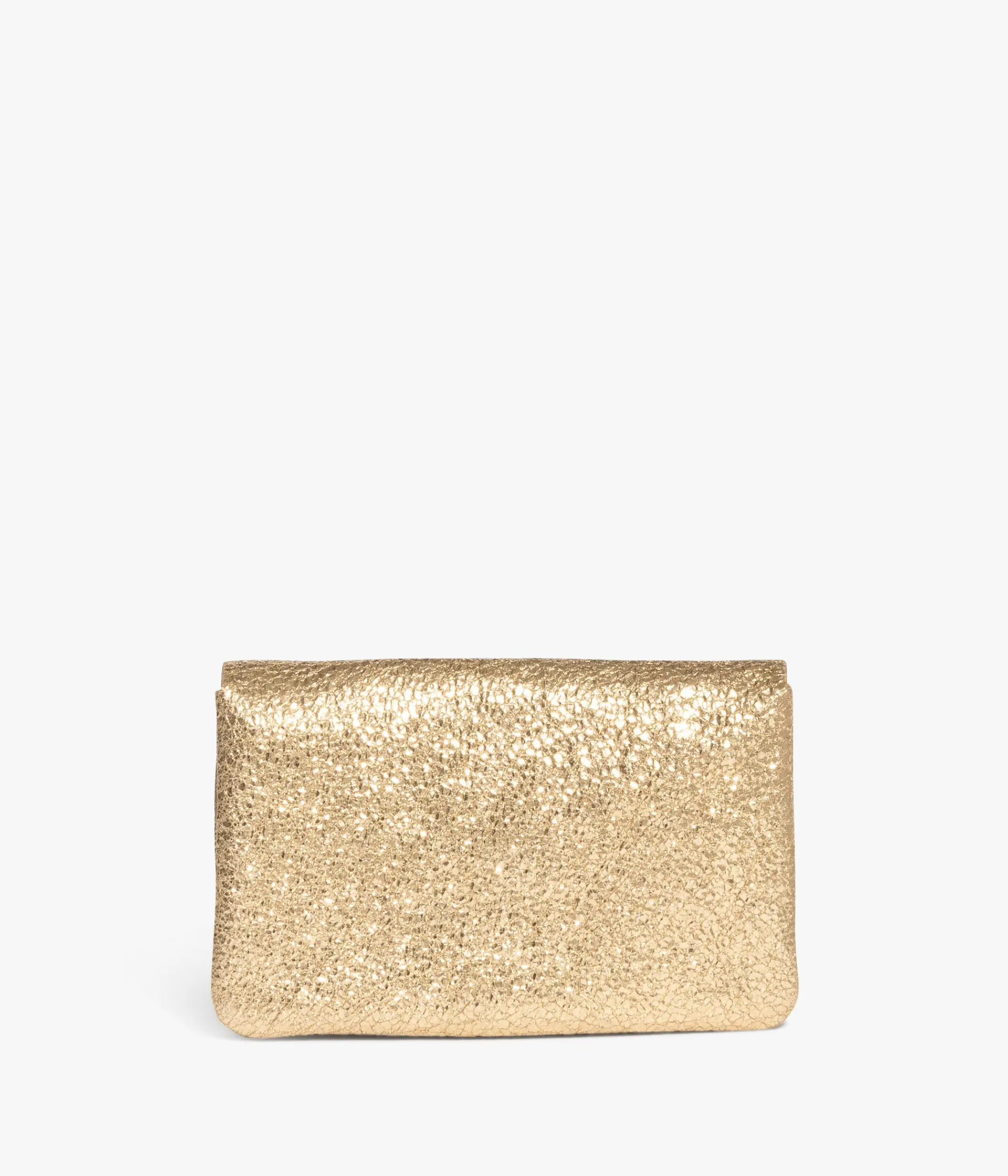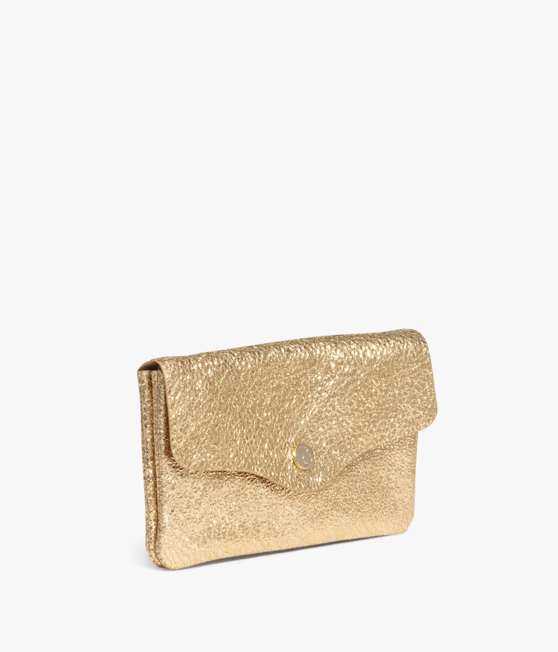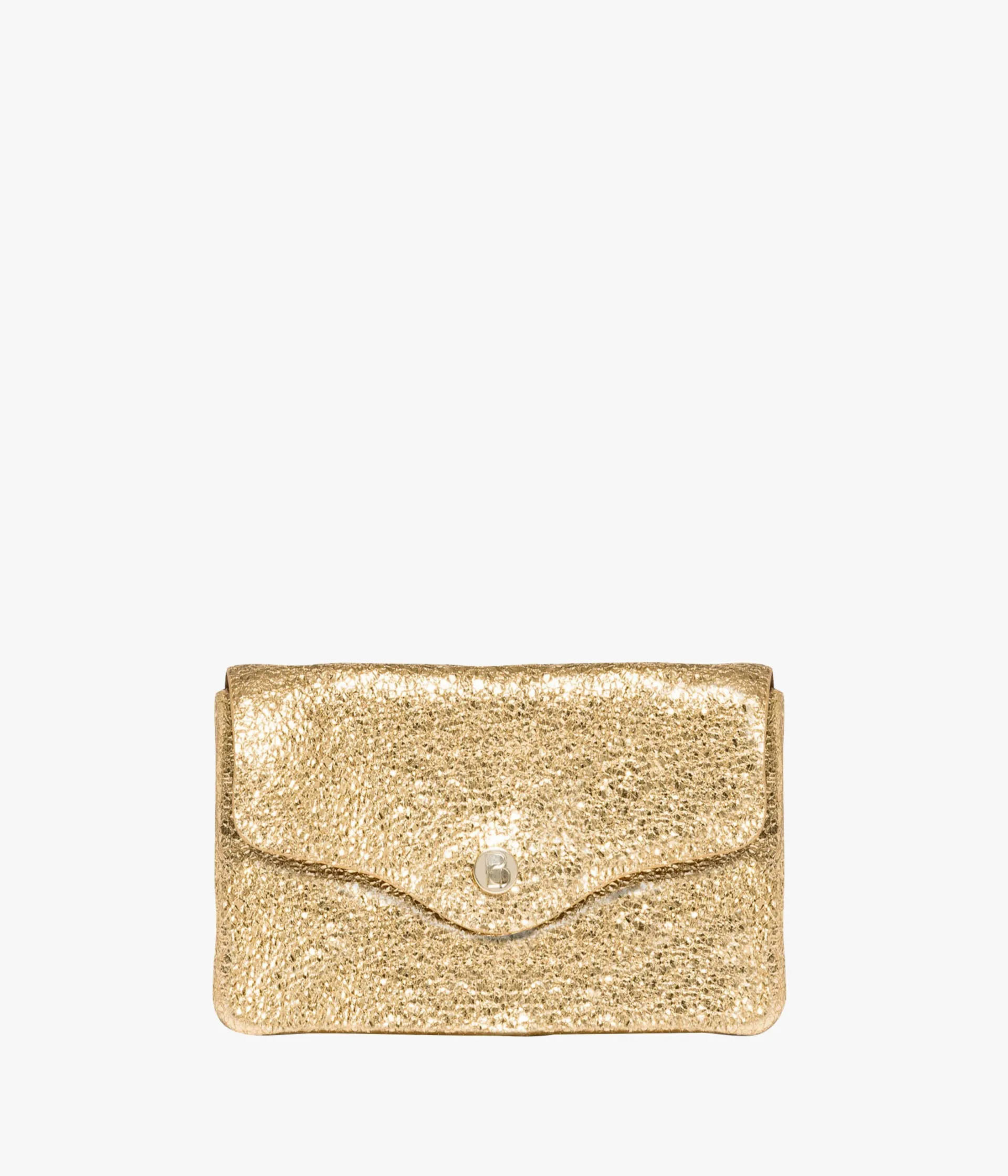 Un portefeuille en cuir métallisé doré effet pailleté. Il se compose de deux grands compartiments dont un zippé, qui permettent de ranger tous vos papiers d’identité, vos cartes de crédit et votre monnaie. Il se ferme grâce à un rabat avec bouton pression orné d’un logo. Un portefeuille ultra chic à glisser dans un sac à main ou à porter à la main comme pochette de soirée. Doublure coton. Dimensions : H10 x L15,5 x P2 cm.