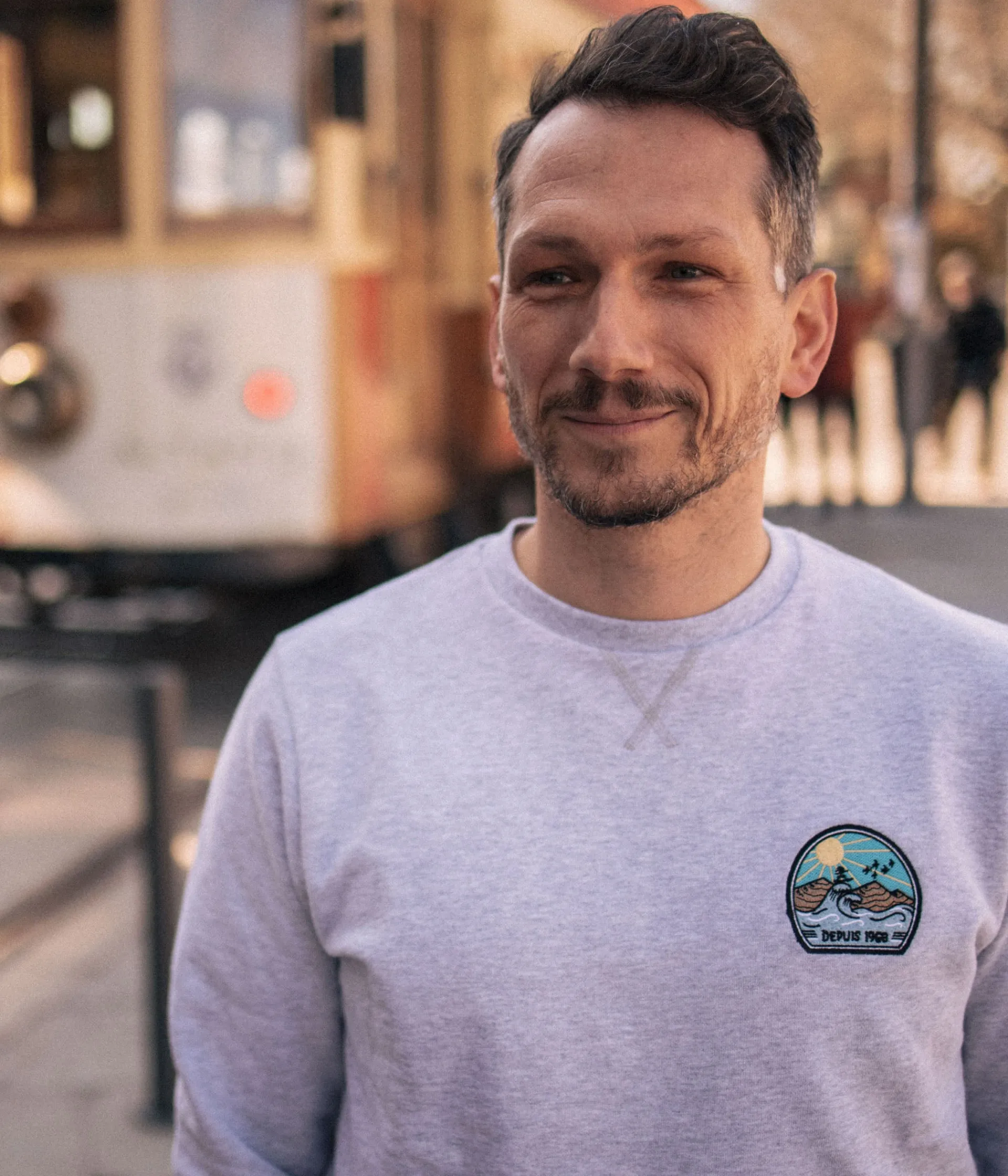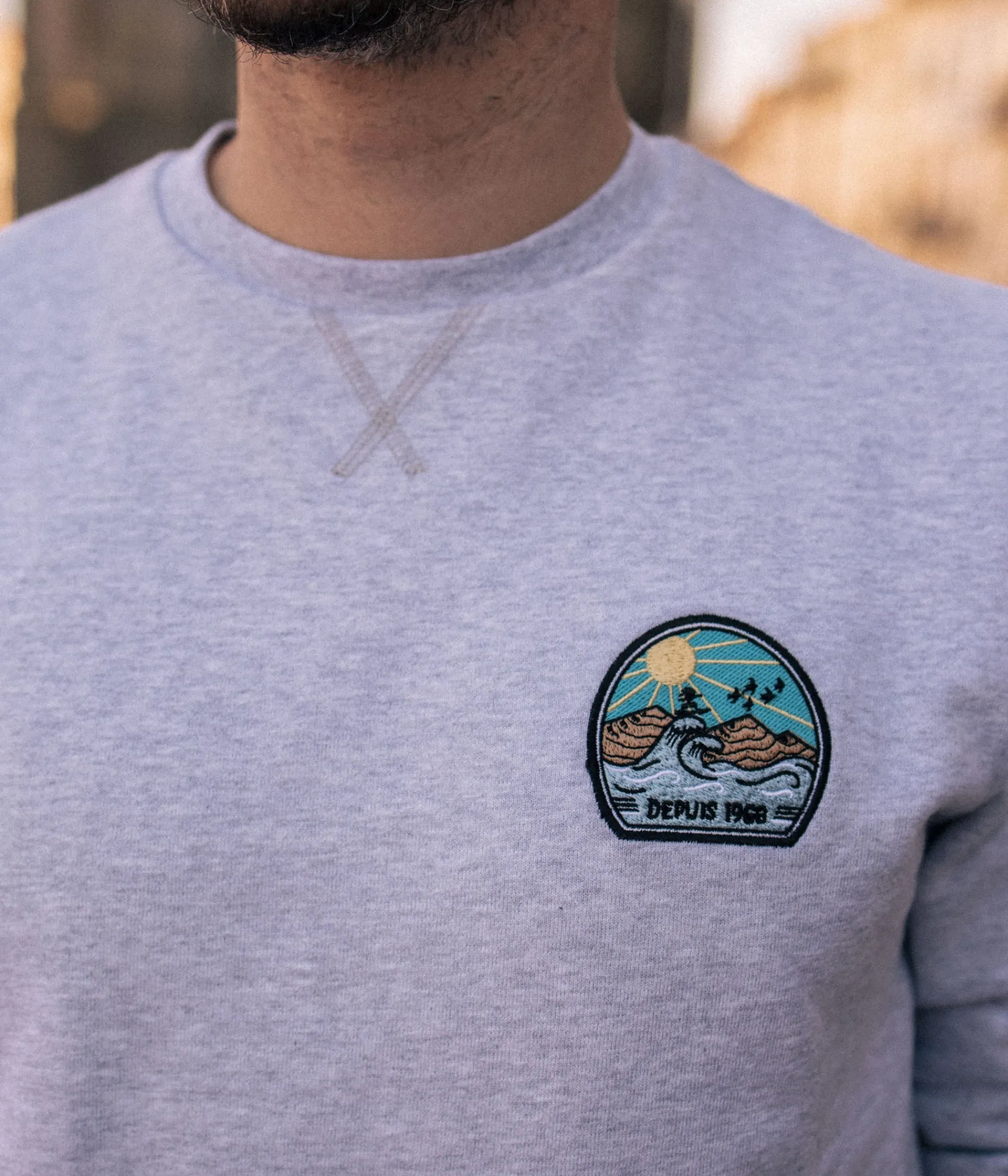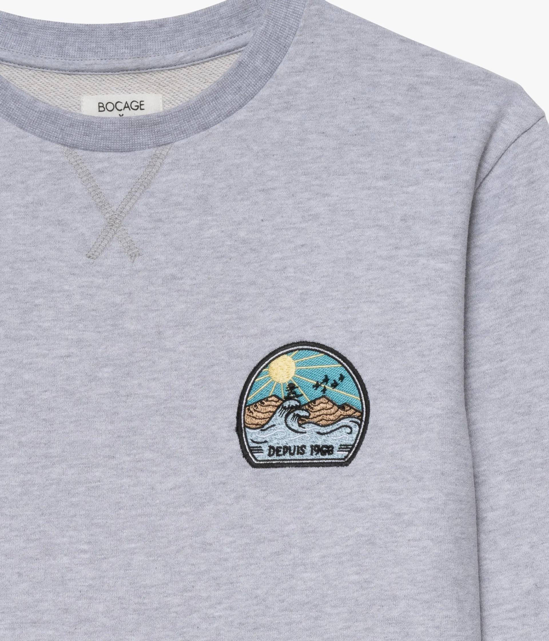 Un sweat gris né de la collaboration exclusive entre Bocage et Docteur Paper. Dans cette collection, l’illustrateur français basé à Nantes met en lumière la région Nord du Portugal, où nos fabricants de chaussures puisent dans leur savoir-faire historique. Un sweat pour homme au coloris chiné agrémenté d’une broderie estivale sur la poitrine. Col rond avec surpiqûre fantaisie. Petite étiquette cousue dans le bas. Finitions bord-côte au col, aux poignets et dans le bas. 100% coton. Intérieur bouclette non molletonné. Longueur 69 cm.