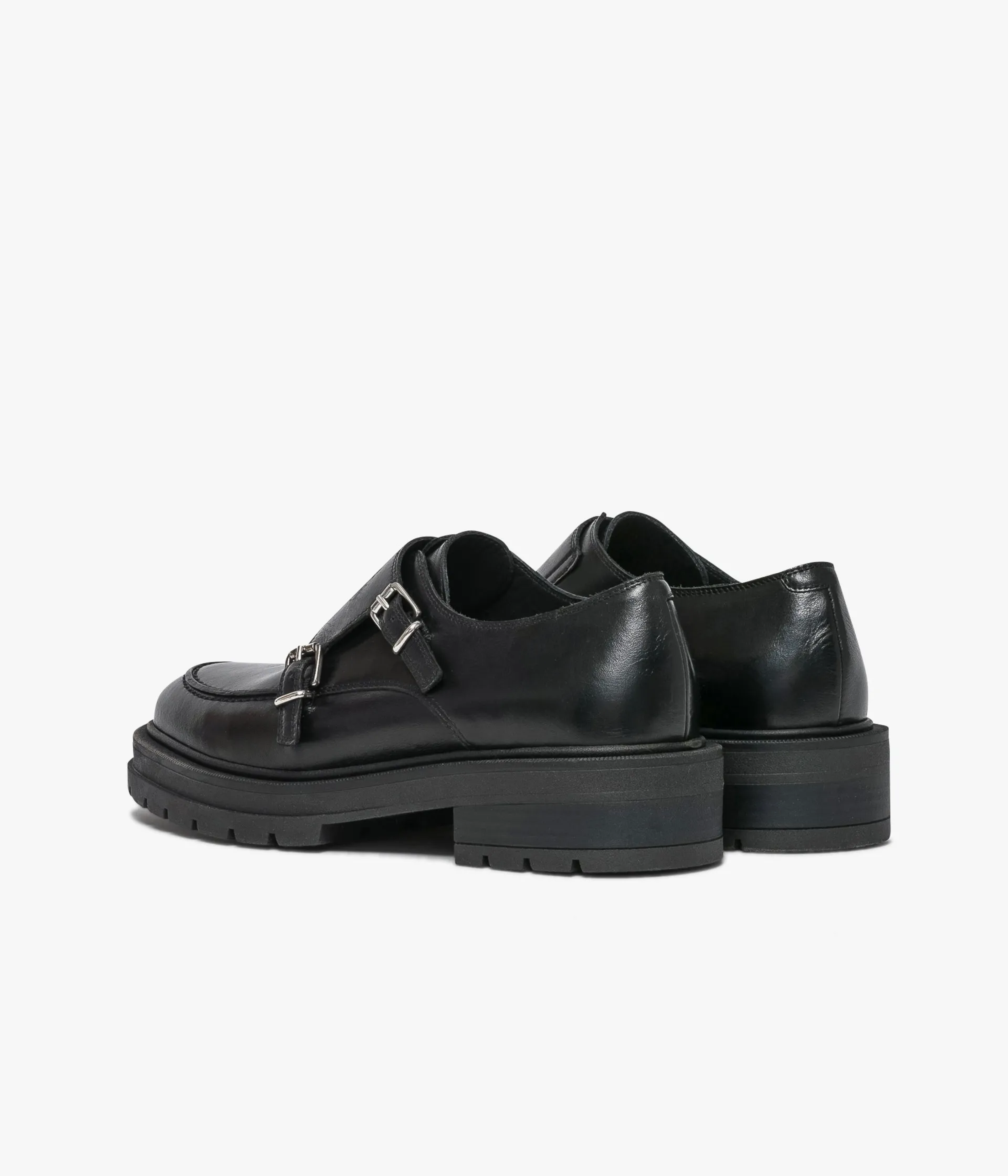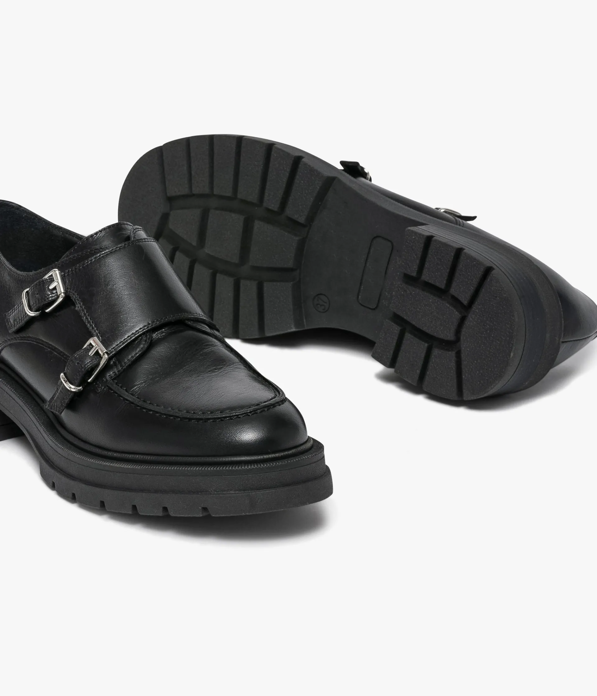 Un mocassin en cuir noir fabriqué avec le plus grand soin. Ce mocassin femme mixe élégamment les genres, inspiré d’un modèle classique avec surpiqûre en relief sur le plateau et patte fermée par deux boucles argentées, il repose sur une épaisse semelle crantée avec trépointe débordante. Un mocassin double boucle, avec élastiques dissimulés sous les boucles, entièrement doublé cuir avec semelle intérieure cuir moussée. Ce cuir aspect patiné peut présenter différentes nuances de couleurs. Semelle 2 cm.