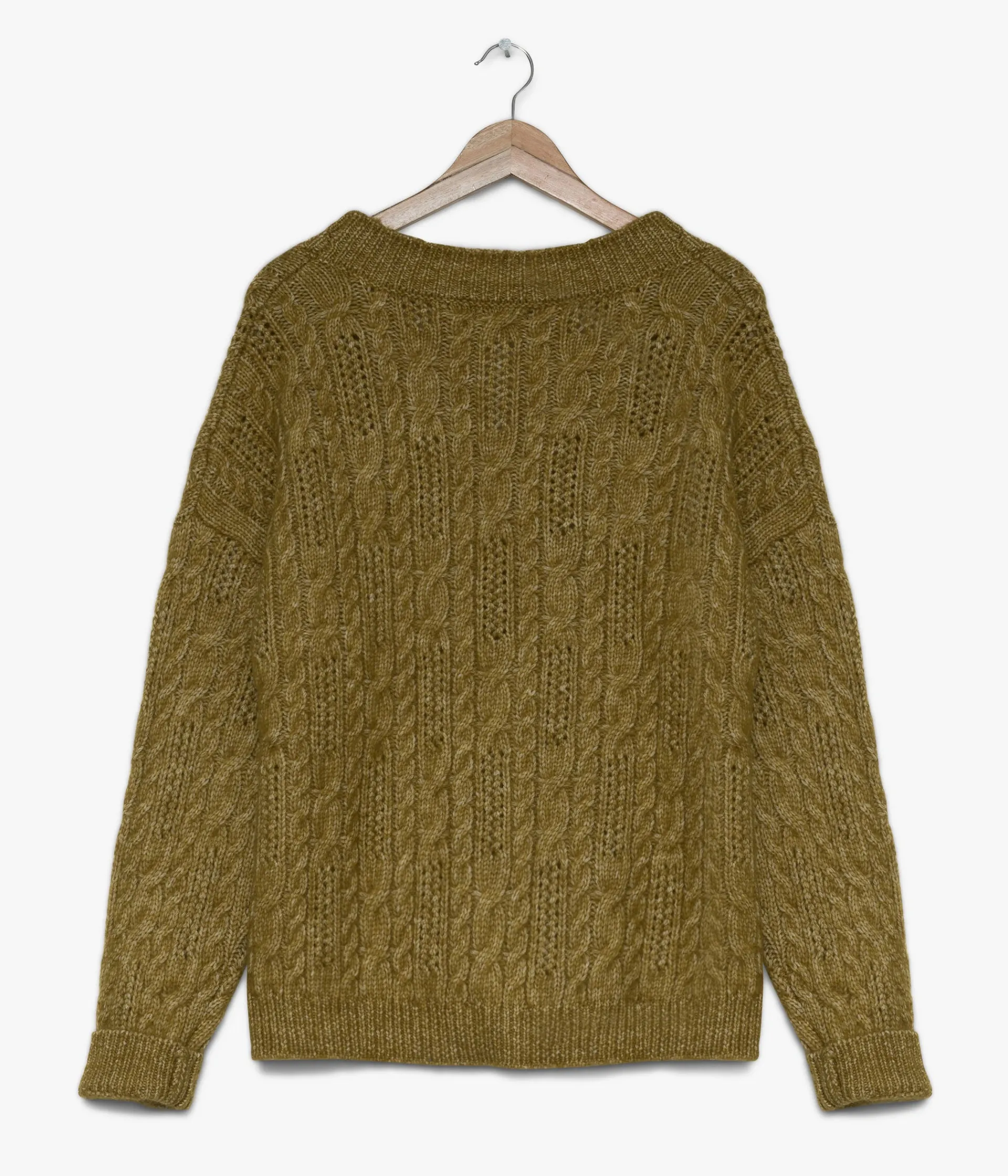 Un gilet vert en maille torsadée particulièrement confortable grâce à sa coupe ample et ses épaules tombantes. Ce gilet à col V est confectionné dans une grosse maille contenant 30% de laine pour offrir plus de chaleur. Il se ferme par trois boutons aspect bois. Finitions bord-côte. Longueur : 60 cm. Disponible en 2 tailles.