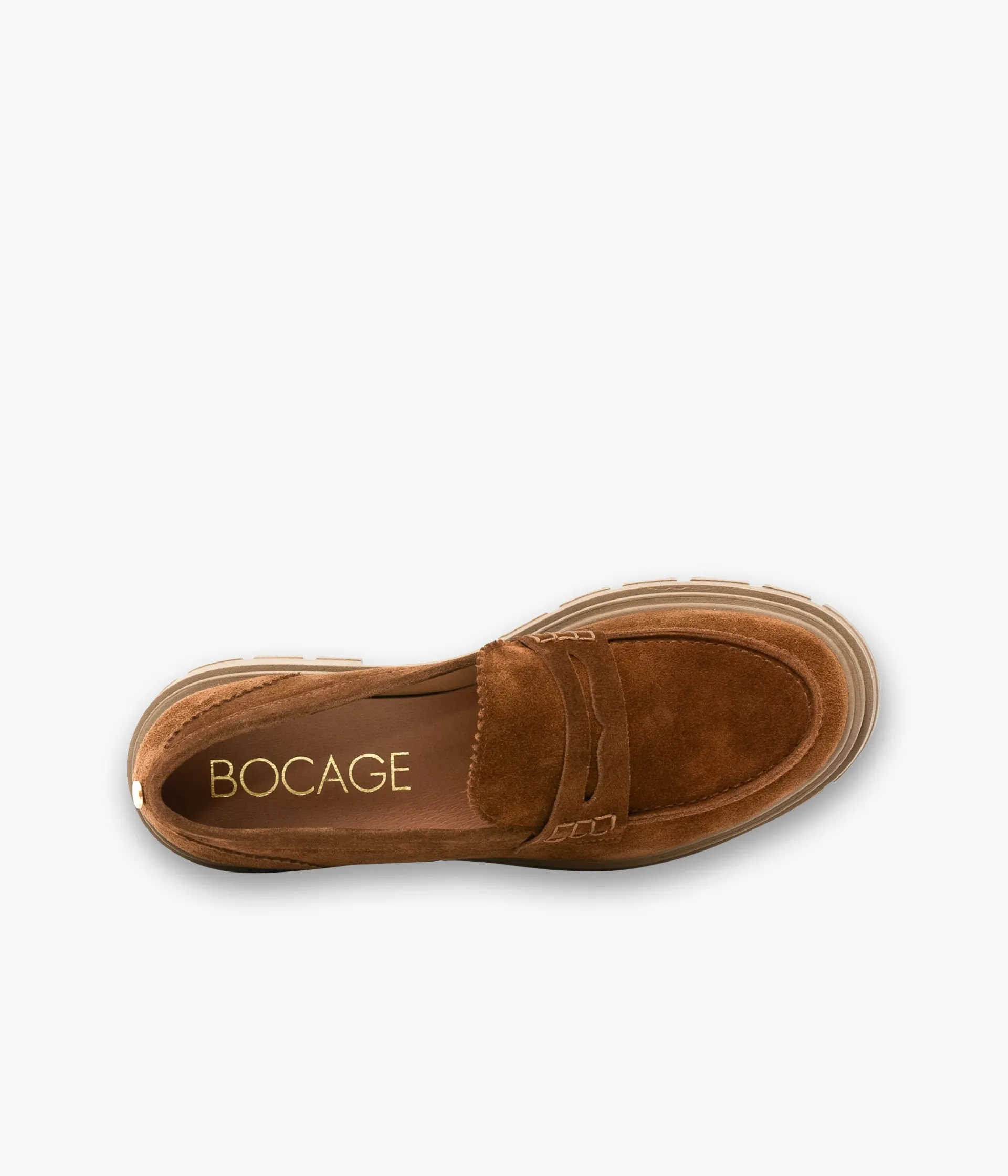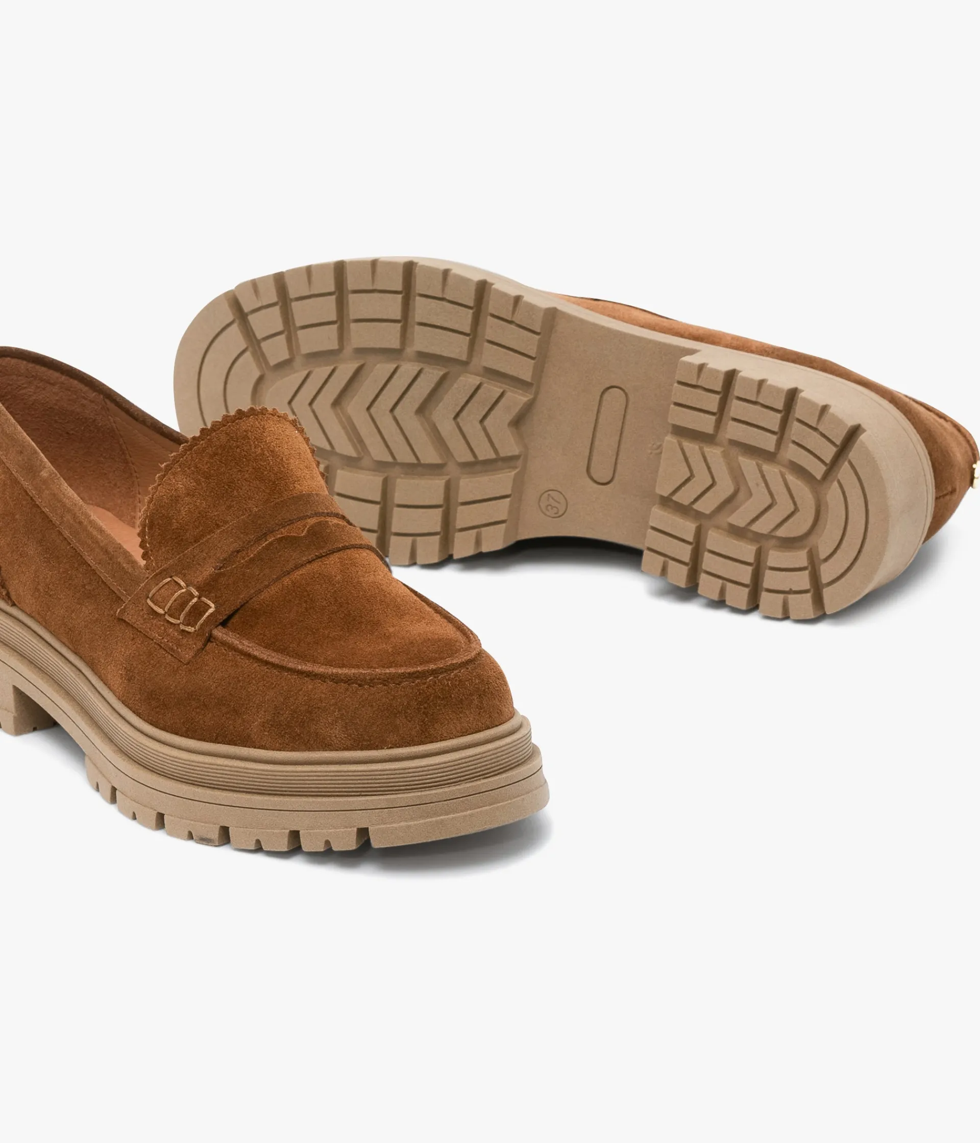 Un mocassin chunky cognac en cuir velours huilé fabriqué avec soin au Portugal. Il affiche une surpiqûre en relief sur le dessus et un bandeau perforé avec piqûres sellier. Ce mocassin se distingue par ses finitions dentelées sur la languette et au talon et par son épaisse semelle crantée. Une chaussure entièrement doublée cuir avec semelle intérieure cuir dotée d’une fine mousse. Petit logo doré au talon.