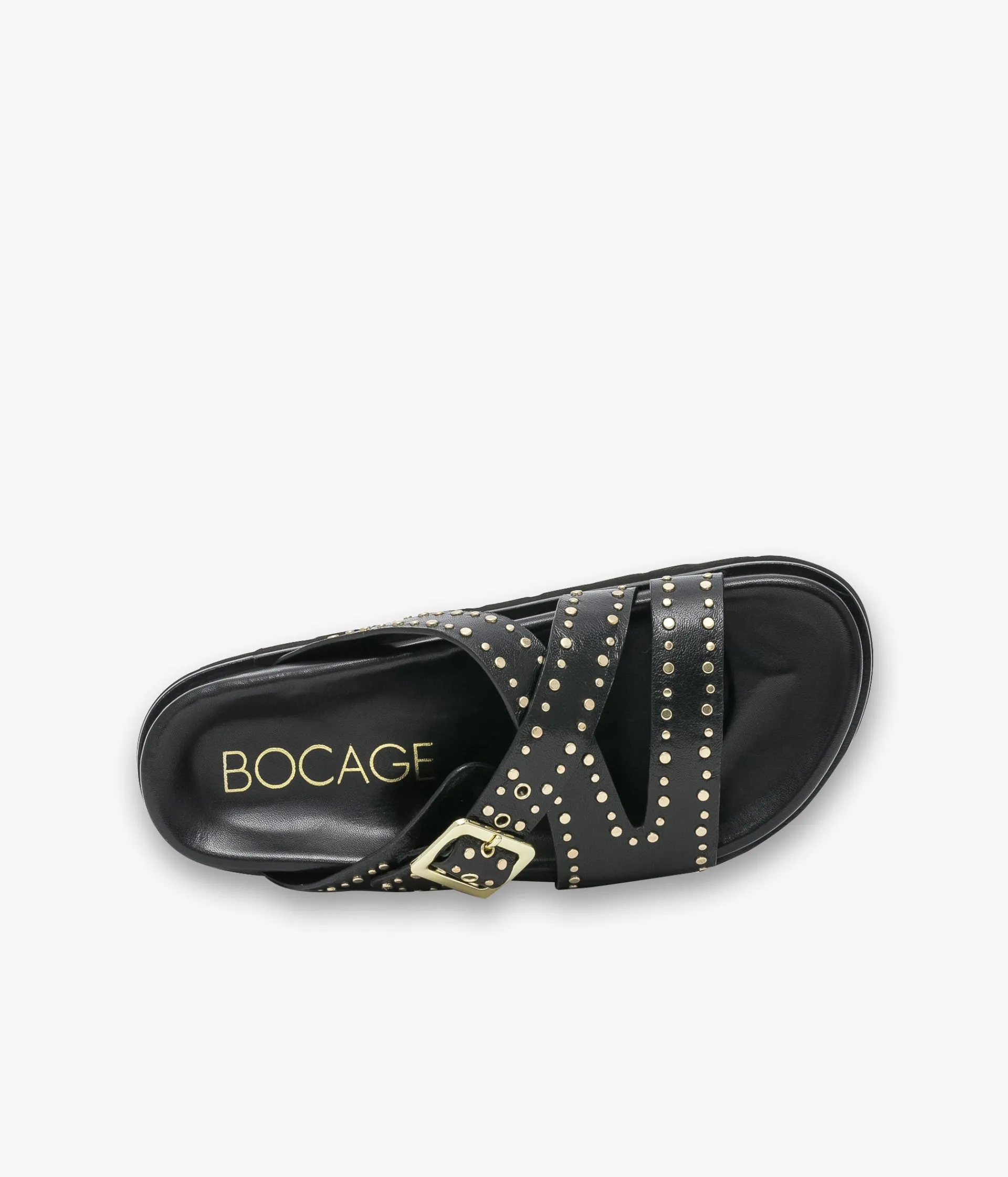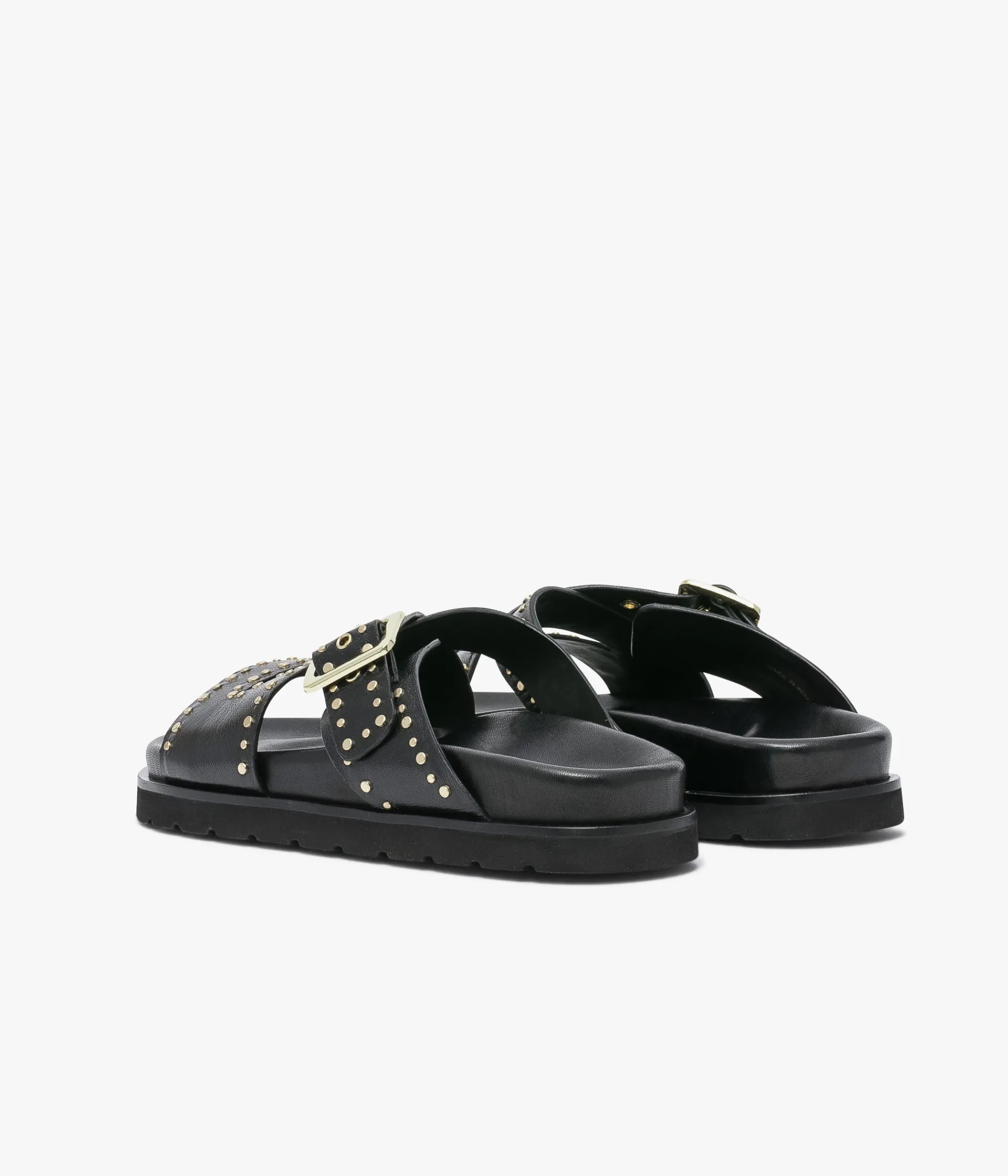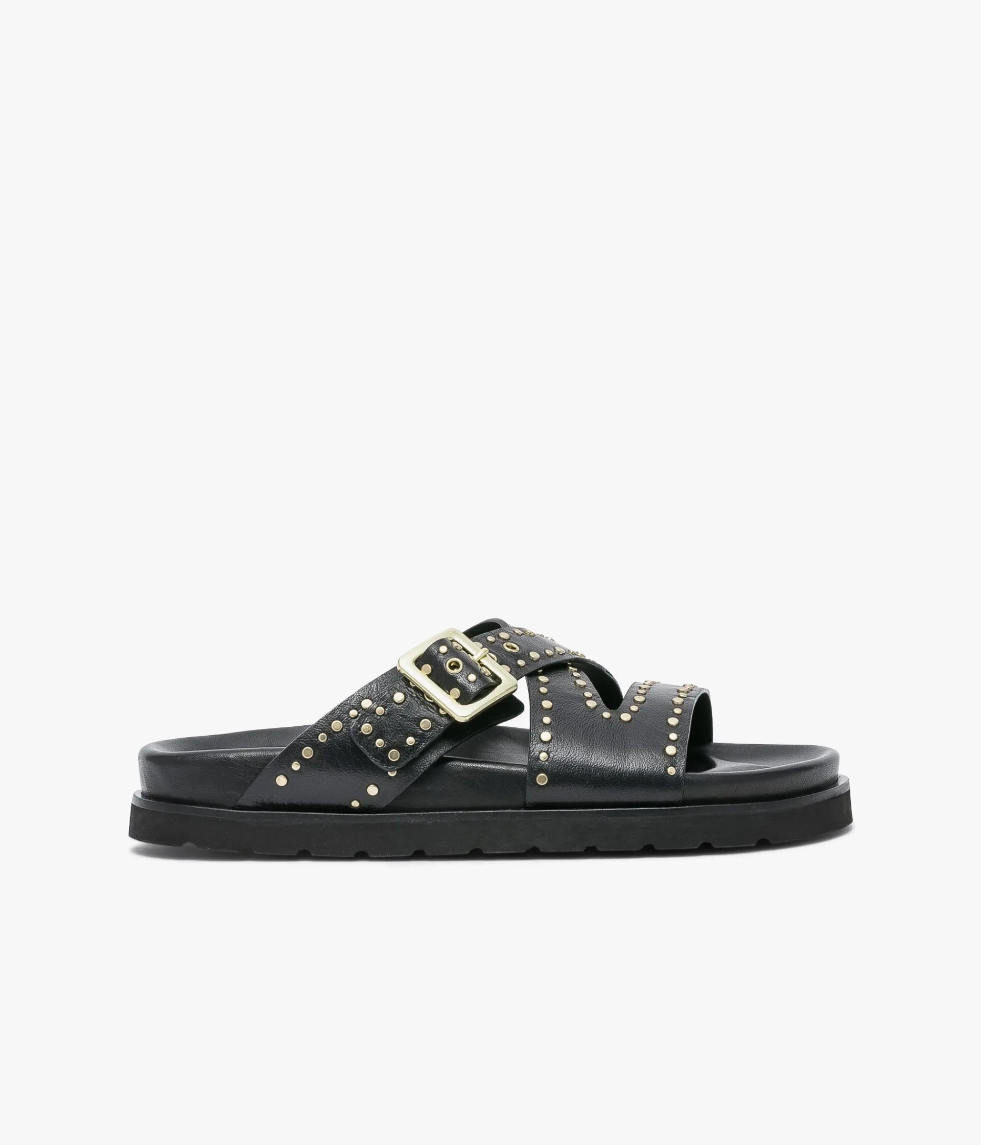 Une mule en cuir lisse noir fabriquée avec le plus grand soin. Une sandale plate aux accents rock dont les brides sont ornées de rivets métalliques. Ces brides enveloppent parfaitement l’avant du pied et s’ajustent à l’aide d’une boucle dorée. Cette chaussure entièrement doublée cuir repose sur une semelle anatomique enrobée de cuir et une semelle extérieure ultra légère avec trépointe cuir. Semelle 2 cm.