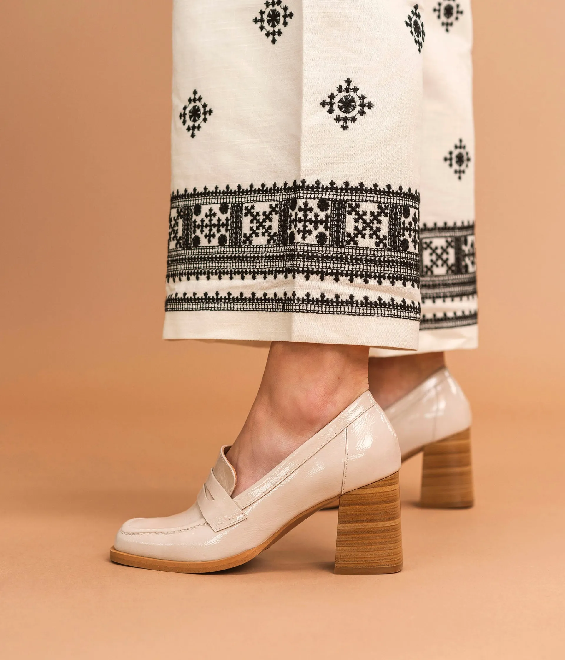 Un mocassin beige en cuir verni, fabriqué avec soin dans notre atelier au Portugal. Une chaussure inspirée du vestiaire vintage avec bout carré et talon flare. Entièrement doublée cuir, elle possède une semelle intérieure cuir dotée d’une fine mousse. Ce mocassin femme repose sur une semelle avec trépointe débordante et un talon lamellé collé. Ce cuir Naplak particulièrement souple peut présenter des irrégularités.