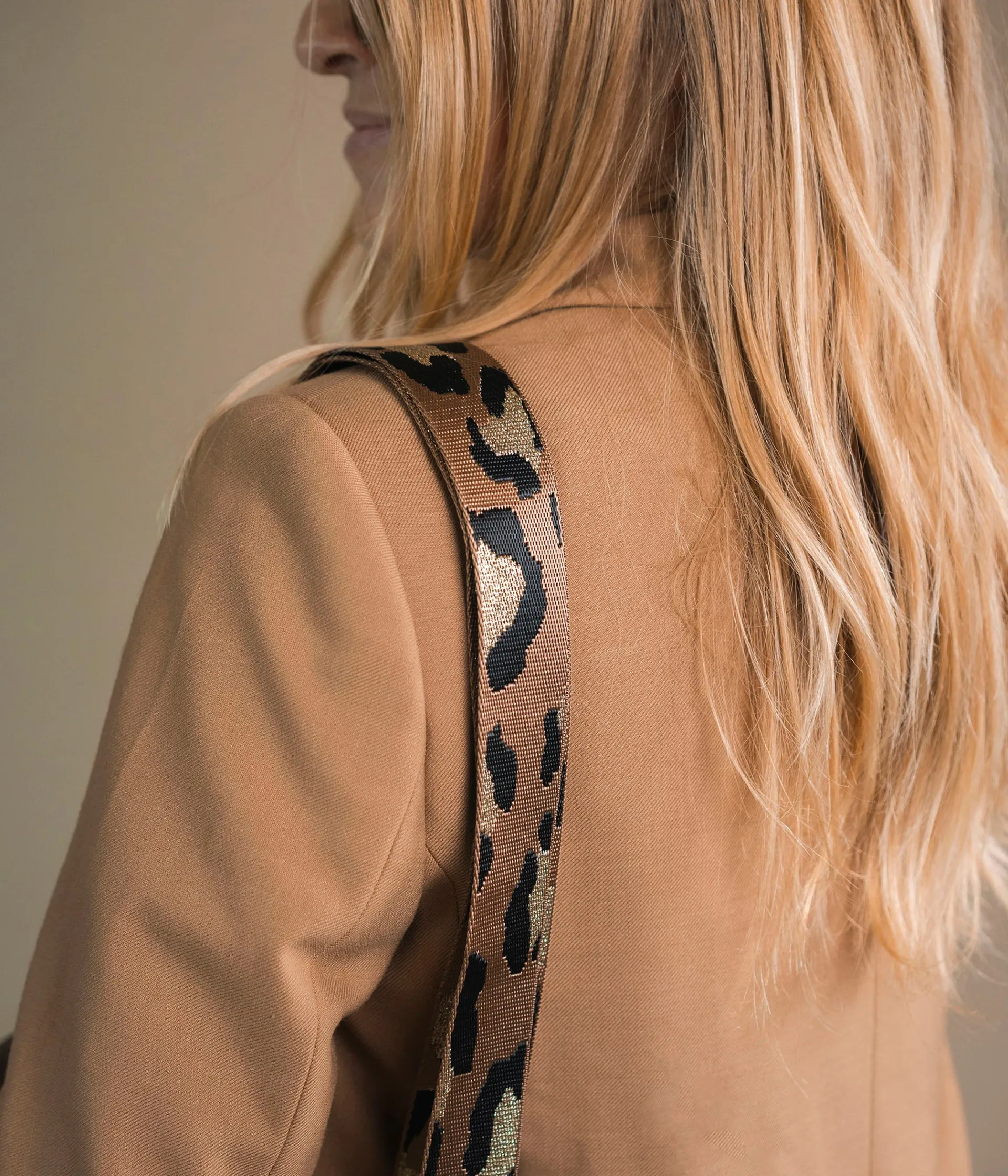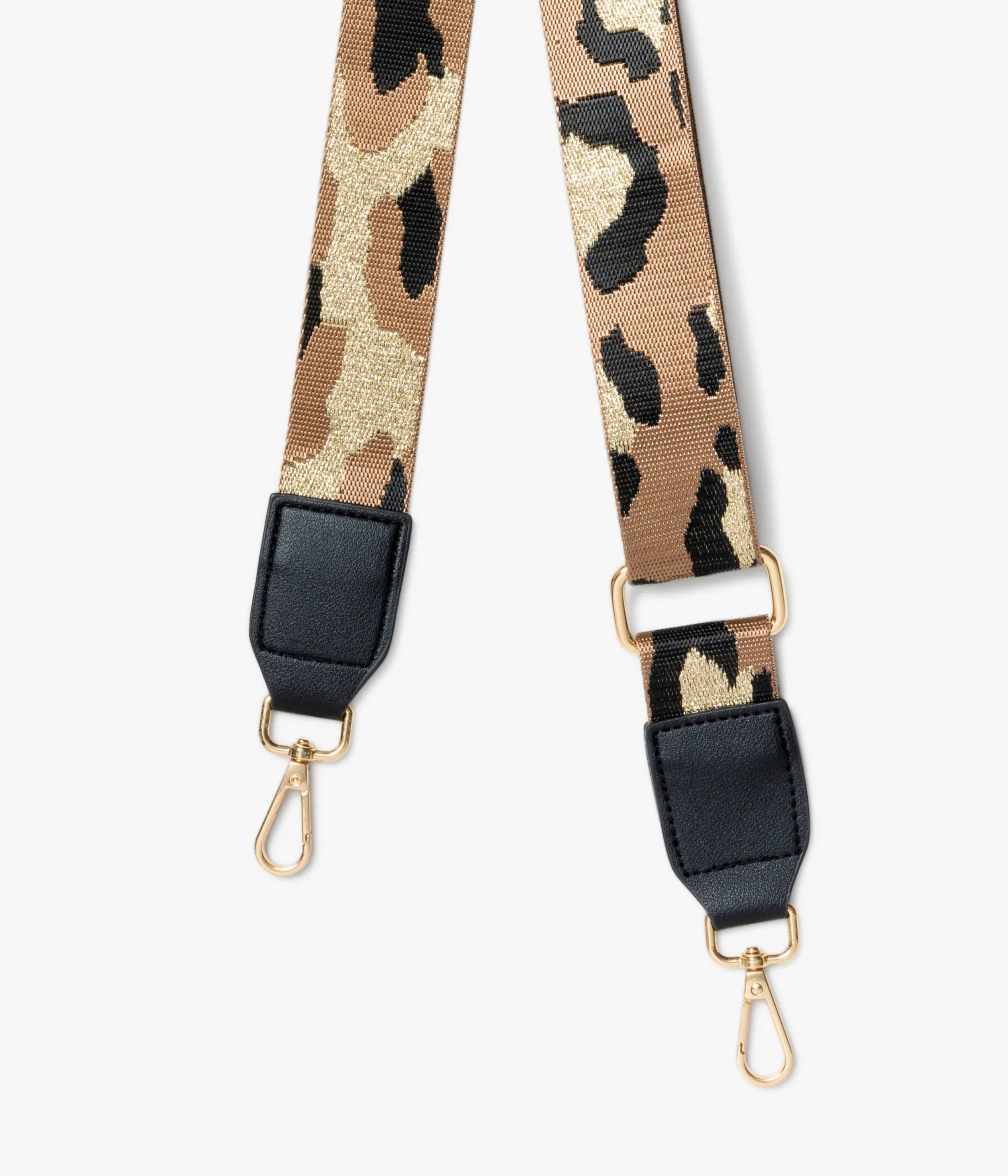 Une bandoulière de sac beige et noir à motifs tachetés incrustée de fil métallisé doré. Cette bandoulière amovible possède des mousquetons dorés à chaque extrémité pour s’adapter sur tous les sacs à main ou sacs banane auxquels elle ajoutera une touche d’éclat ultra tendance. Elle est ajustable en longueur grâce à une boucle. Largeur 4 cm.