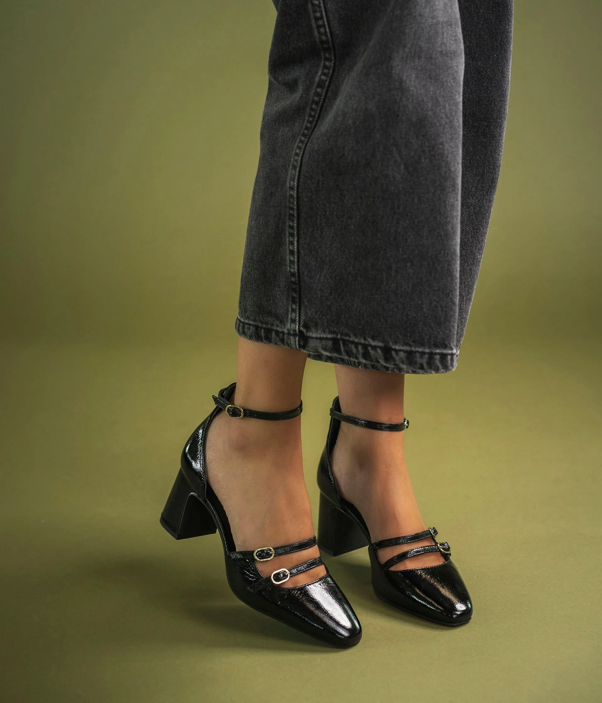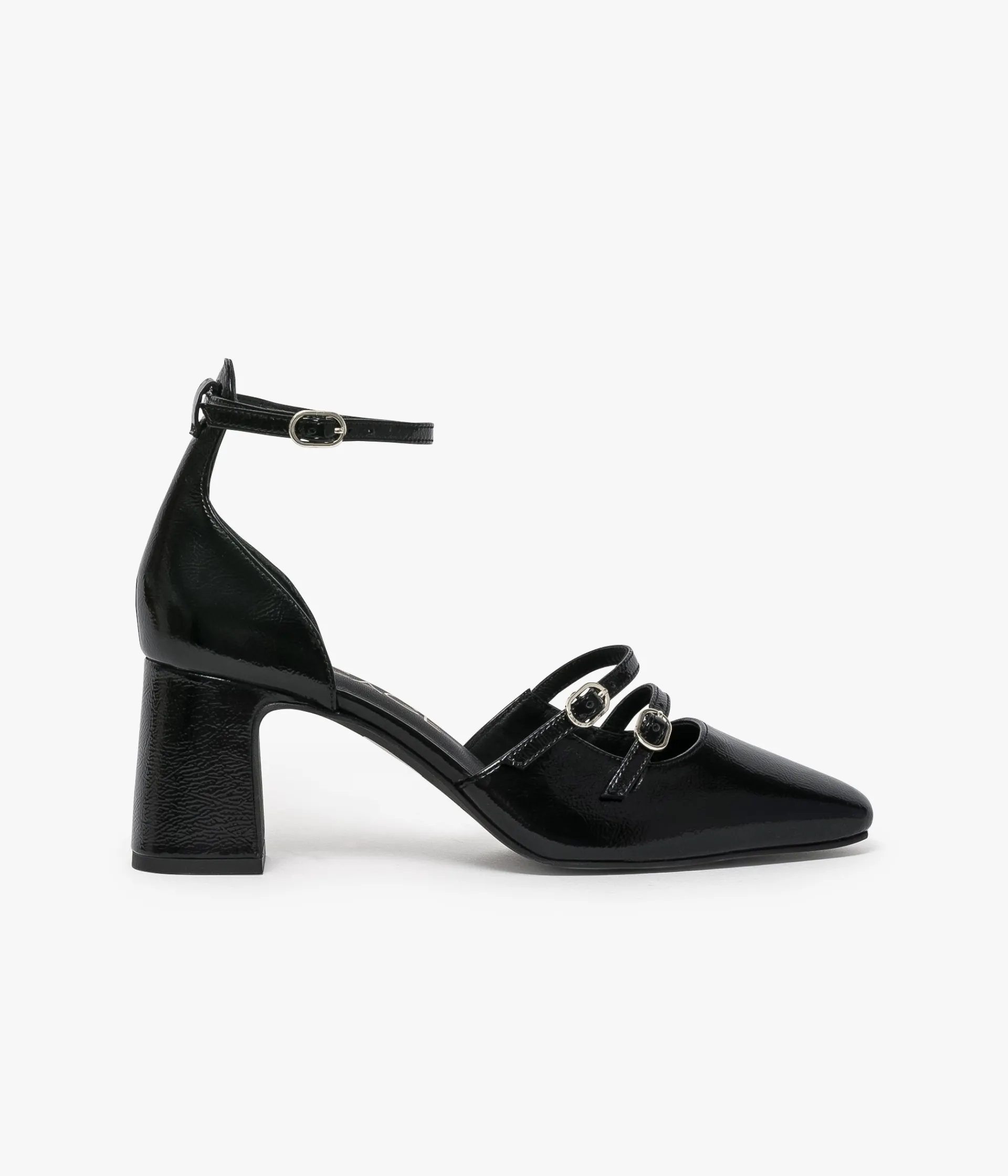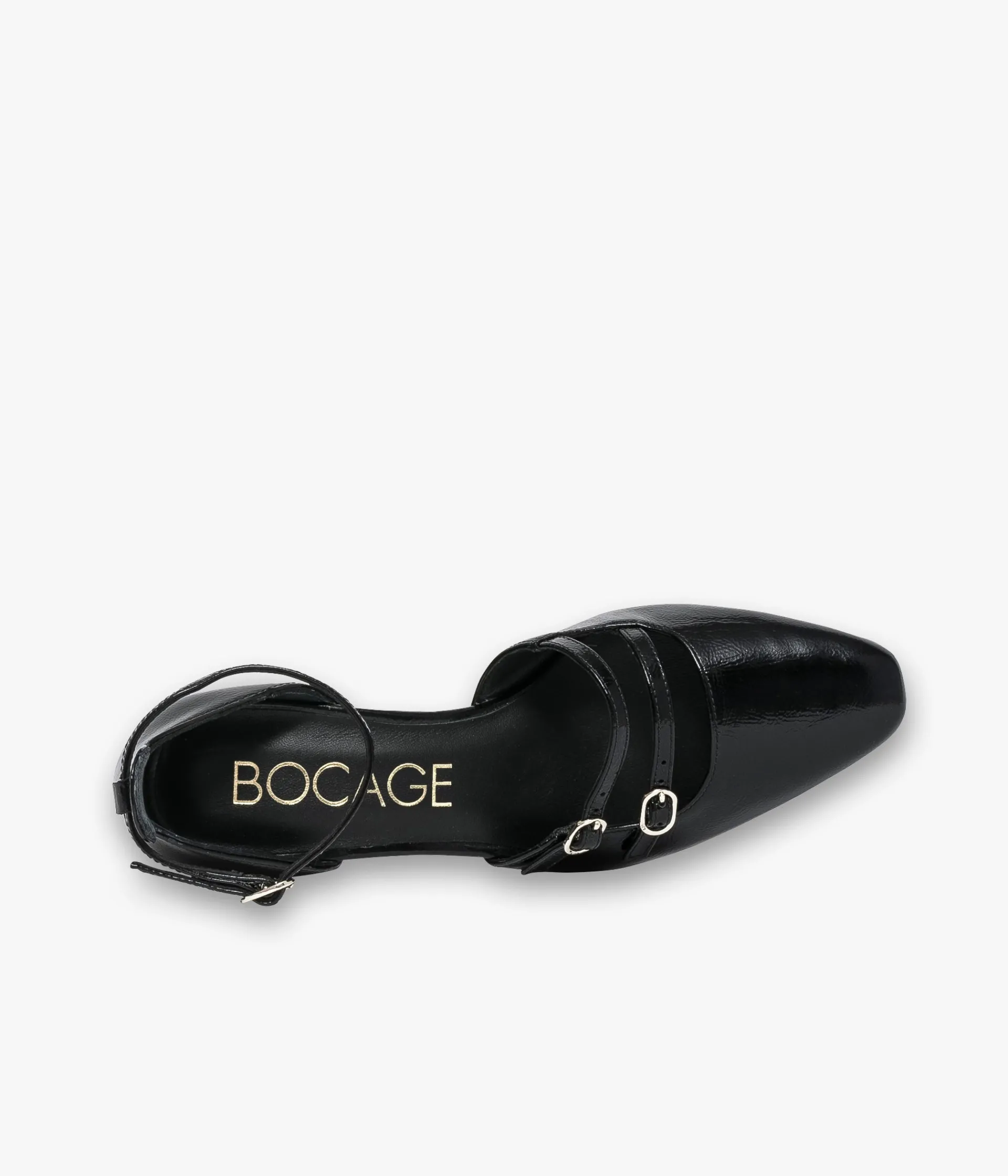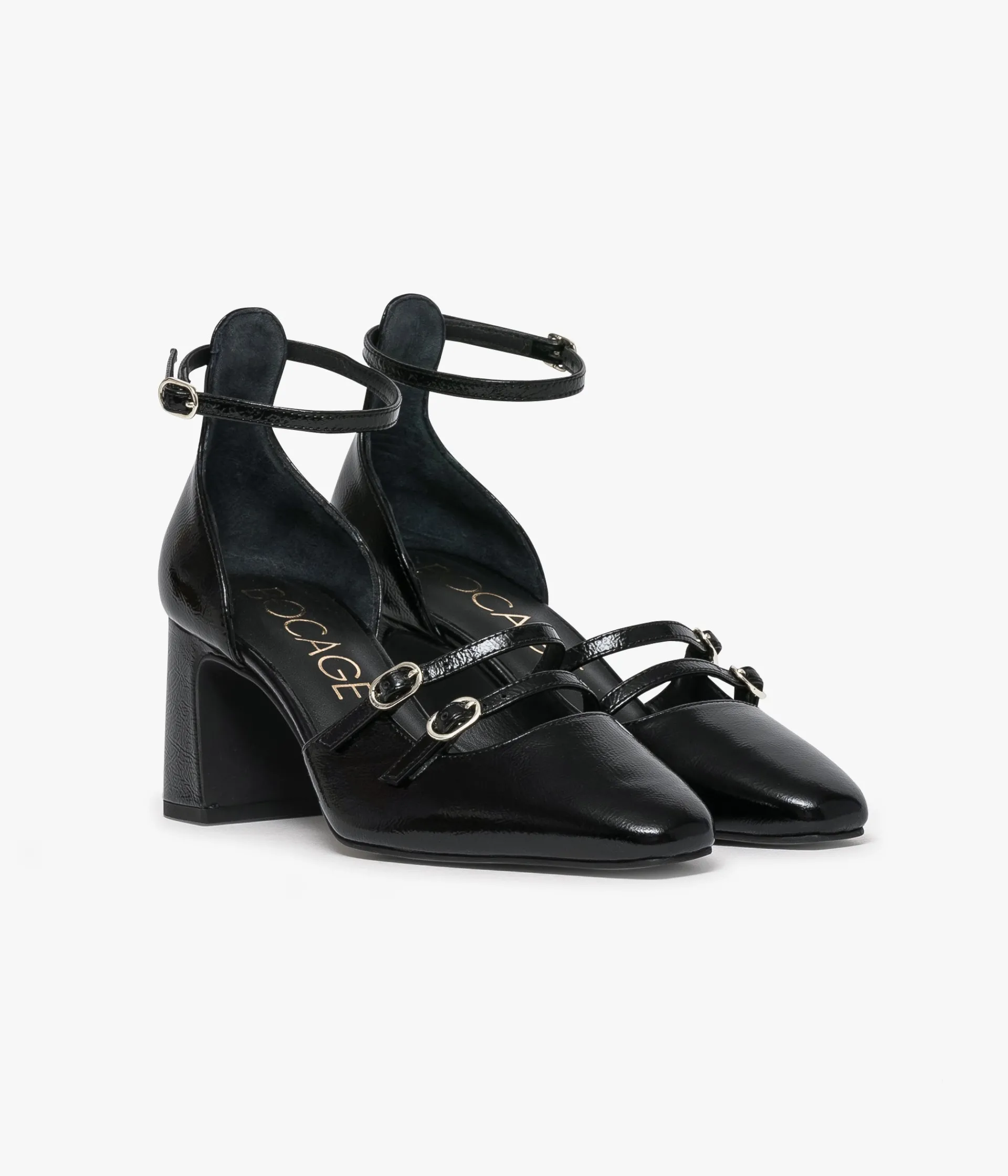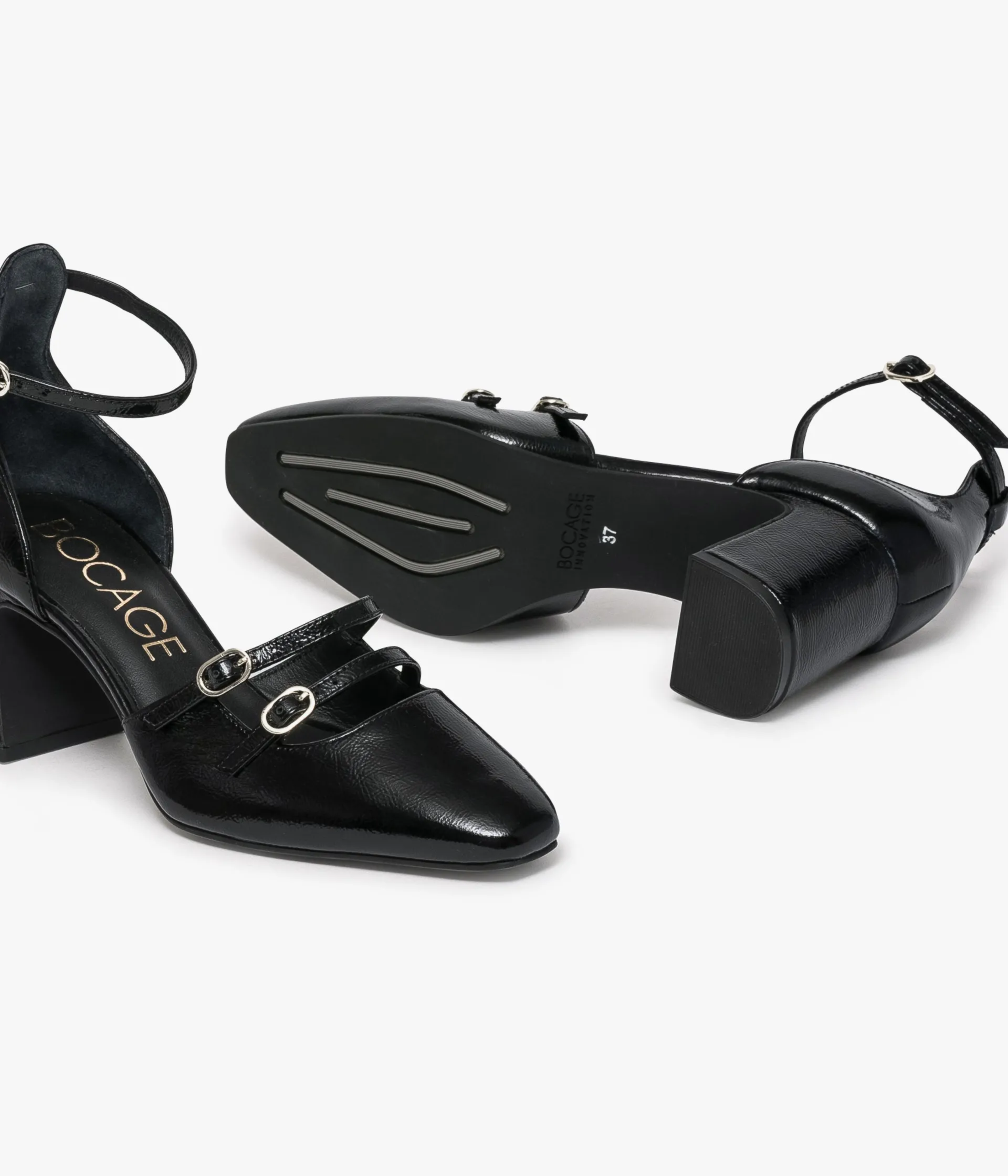 Un escarpin en cuir verni noir fabriqué avec le plus grand soin. Cette chaussure élégante sublime le pied grâce à ses élégantes brides fermées par des boucles ovales en métal doré, sur le dessus et autour de la cheville. Elle arbore une allure subtilement rétro avec son bout carré et son talon à gorge. Un escarpin entièrement doublé cuir avec semelle intérieure cuir dotée d’une fine mousse. Notre technologie Bocage Innovation vous garantit un bien-être inégalé. La semelle dissimule des élastiques qui permettent à votre chaussure de s’adapter à votre pied. Ce cuir Naplak particulièrement souple peut présenter un aspect légèrement froissé.