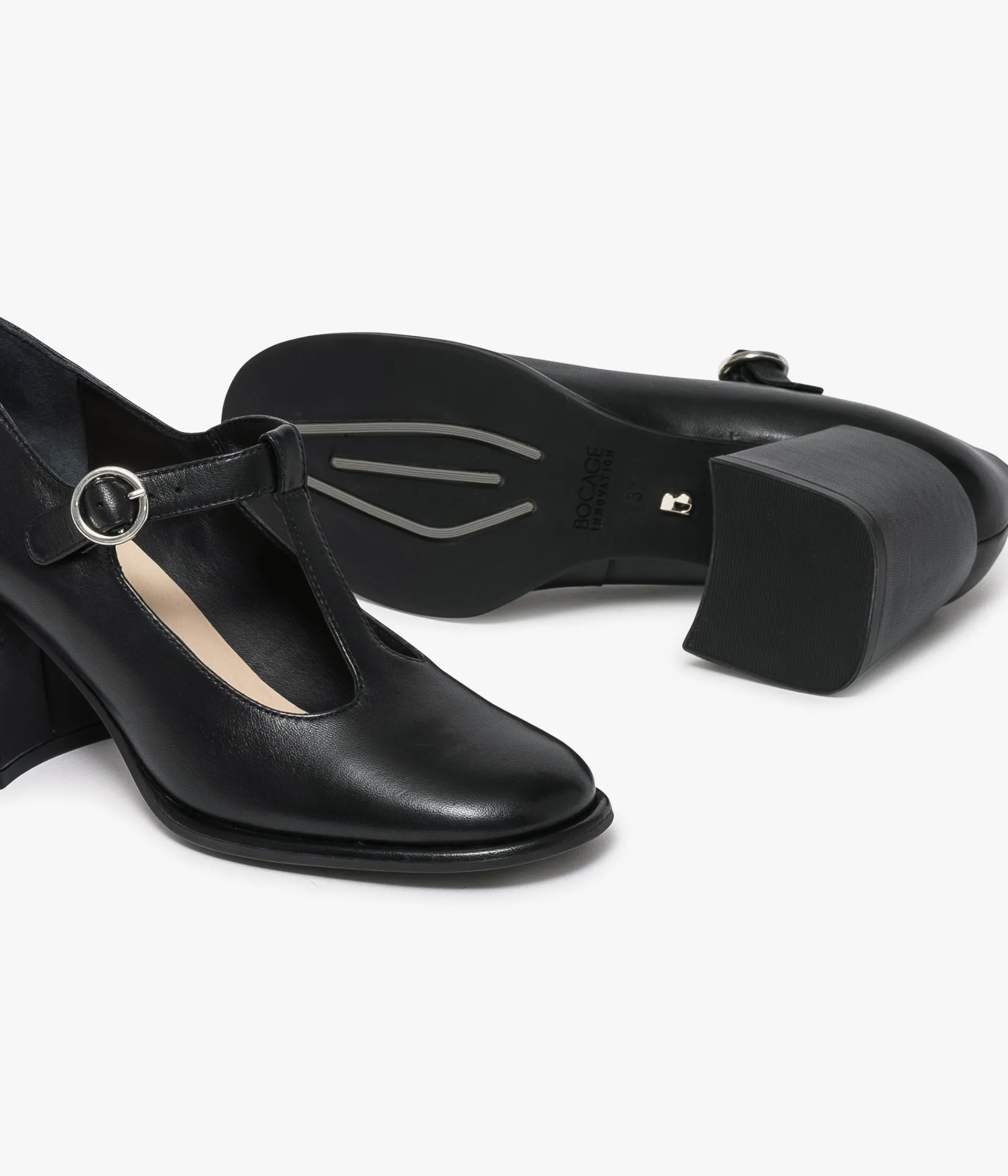 Un escarpin Salomé noir en cuir lisse fabriqué avec le plus grand soin. Avec son bout arrondi et son imposant talon flare enrobé de cuir, il arbore une silhouette minimaliste typique du style nordique. Il se ferme à l’aide d’une boucle ronde dorée et repose sur une semelle débordante avec trépointe cuir. Notre technologie Bocage Innovation vous garantit un bien-être inégalé. La semelle dissimule des élastiques qui permettent à votre chaussure de s’adapter à votre pied. Une chaussure entièrement doublée cuir avec semelle intérieure cuir dotée d’une fine mousse.